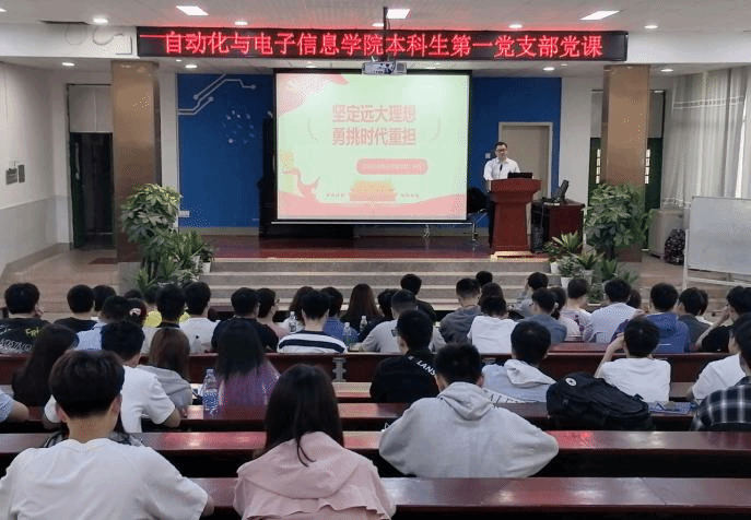 本科生第一党支部全体党员在工科楼阶梯教室共上一堂党课,本次党课主题是《坚定远大理想,勇挑时代重担》,主讲人是学院党委委员张莹。
