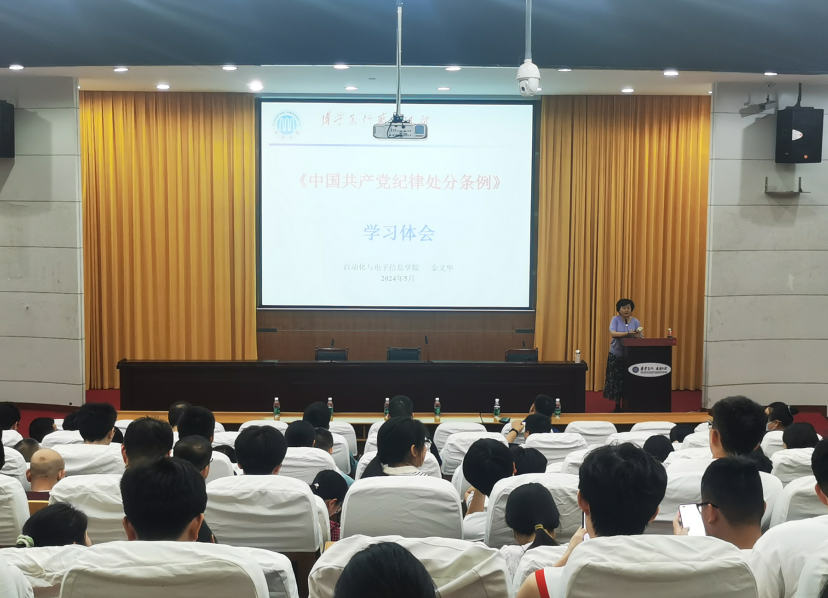 党委在逸夫楼一报告厅组织开展了党纪学习暨毕业生党员离校教育。院党委书记金义华以“《中国共产党纪律处分条例》学习体会”为主题,为全院师生党员主讲了一场生动的党课。
