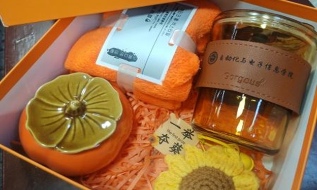 为了表达对考研学子的美好祝愿,支部精心准备了寓意深刻的礼物:葵花钥匙扣象征着“一举夺魁”,期愿学子们在考试中脱颖而出;竹节杯寓意着坚持不懈、突破困境,勇攀高峰、节节高升;“柿柿如意”陶瓷罐祝愿考研学子能够心想事成,事事如意;橙色方巾承载着学院的关怀与期望,希望同学们注意身体,劳逸结合,以最佳状态迎接考研的挑战。