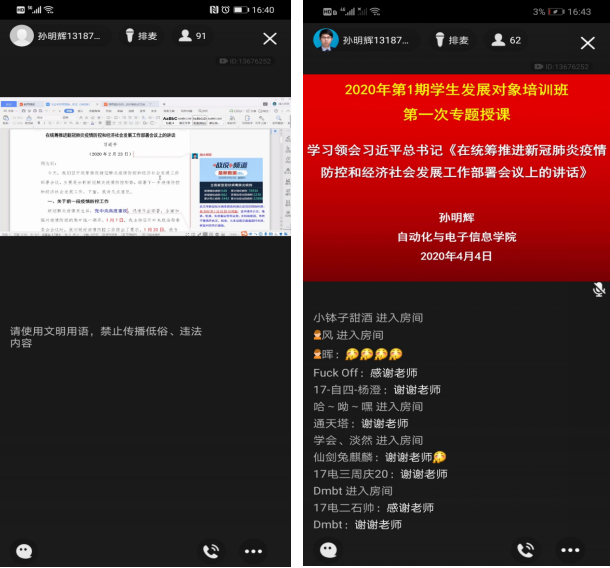 2020年第1期发展对象培训班线上开班典礼及第一次专题授课。本次开班典礼由学院党委孙明辉副书记主持,参加开班典礼的有学院党委金义华书记、专职组织员刘桂珍老师、培训班班主任黄春晖老师以及全体学员。