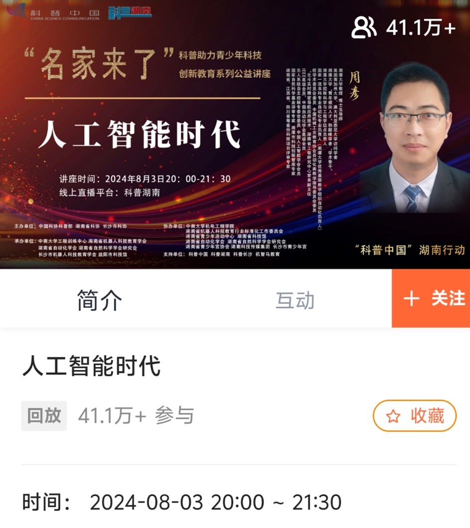 讲座主要面向青少年学生、科创辅导教师、家长朋友和广大科技爱好者,周彦教授的讲座当天参与人数达41.1万之多,影响面非常广。