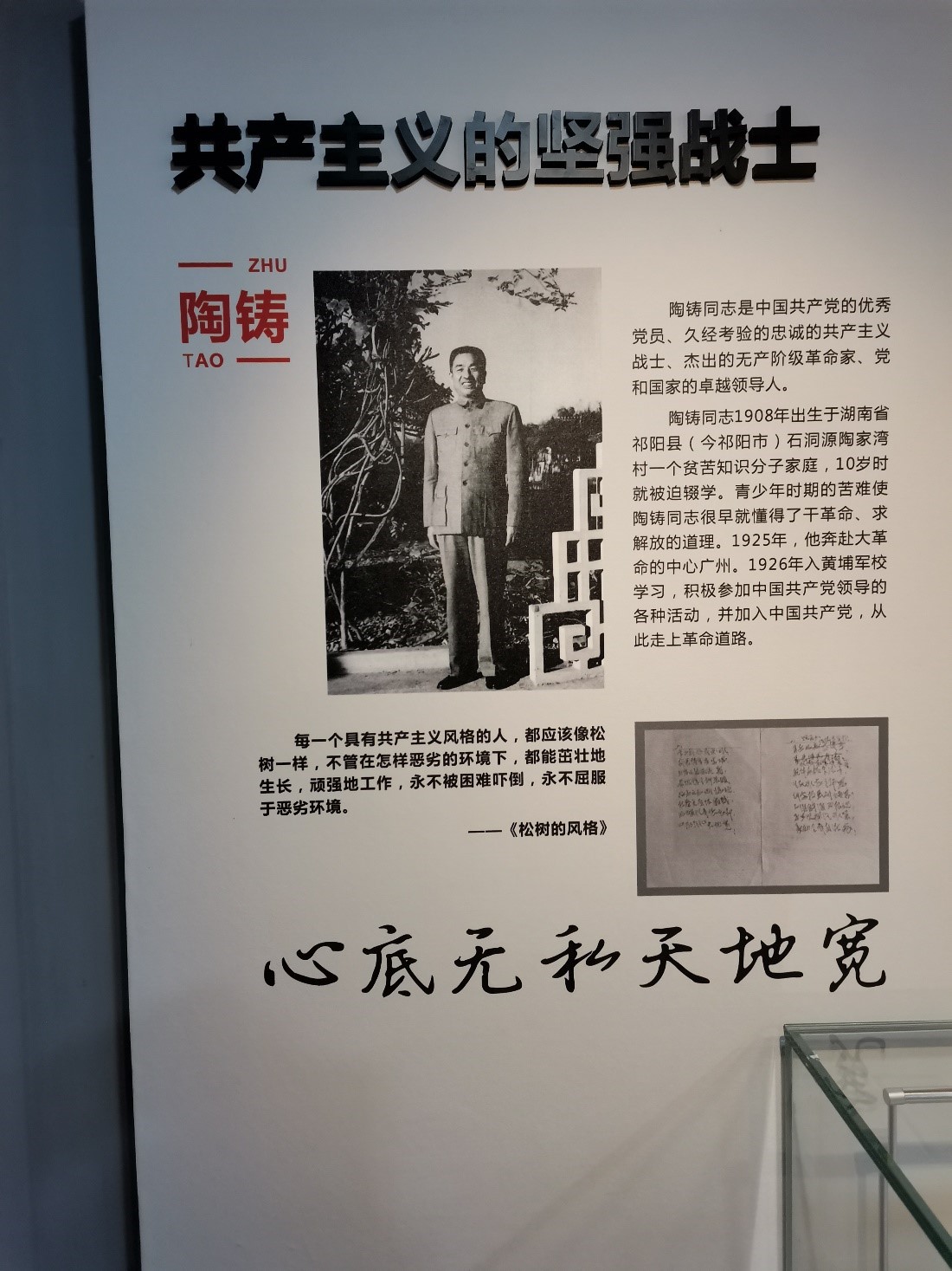 在陈列馆第二层参观过程中,团队成员深刻感受到永州在抗日战争中所做出的牺牲和贡献,学习了永州籍贯的著名革命家如李达、陶铸、江华等人的感人故事。其中,“陶铸回家省亲”的故事发人深省、引人深思。1951年,陶铸调华南分局工作,顺路回到了阔别20多年的故乡。到家后,妹妹看着戴着棕丝斗笠、穿着草鞋、一身粗布衣衫的陶铸,欢喜之余,感到奇怪:“人家都说你做了大官,我看还像个老长工”,足以见其生活简朴。在介绍陶铸的展厅中,书写着“心底无私天地宽”七个字,“心底无私天地宽”出自陶铸《赠曾志》,这也是对陶铸本人最好的诠释,他始终秉承着赤诚之心为人民服务,无私奉献,内心坦荡。
