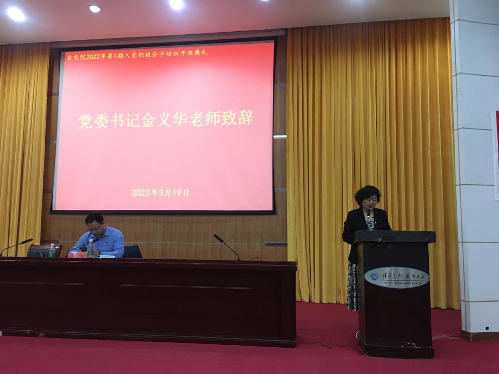 会议第二项,金义华书记致辞。她对参加本期入党积极分子培训的全体学员表示欢迎和祝贺,同时指出学生党员发展工作是学院高度重视的工作,重在培养具有坚定共产主义信念、品学兼优的优秀积极分子、优秀共产党员,希望同学们珍惜本次培训学习机会,深入学习和理解党的知识,做到理论联系实际,积极为人民服务,发挥模范带头作用,争取早日加入中国共产党。