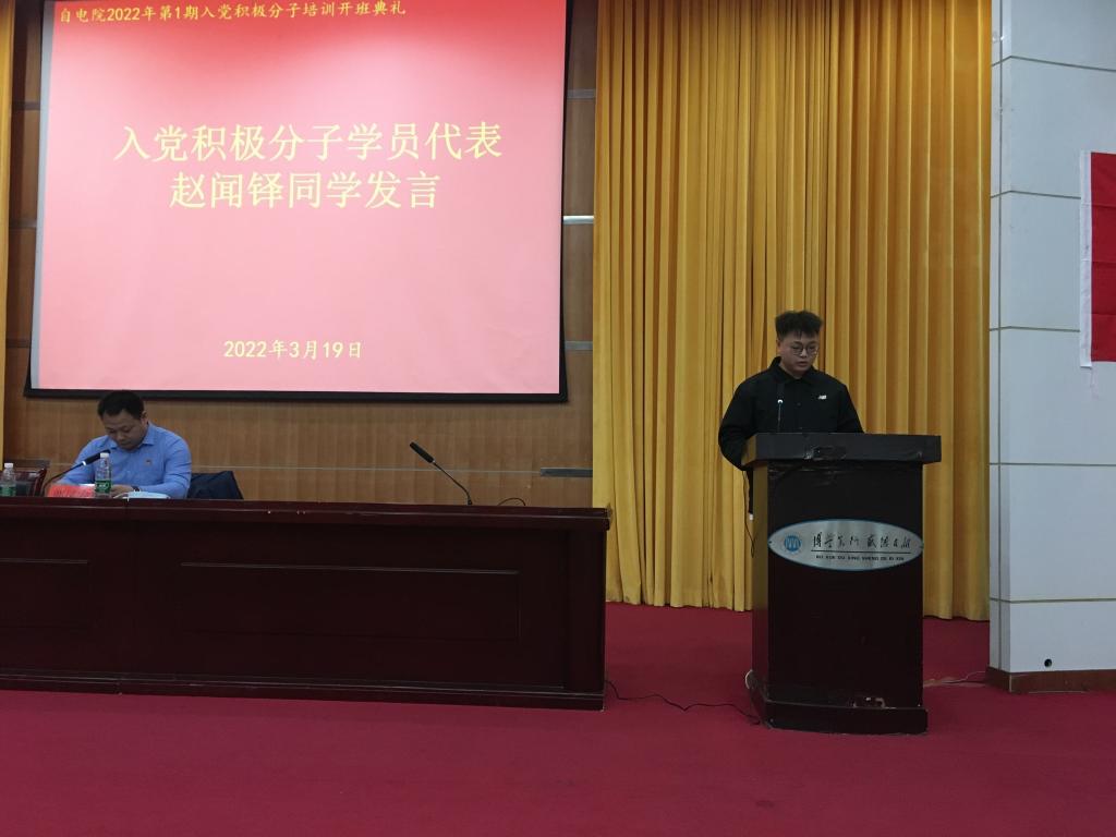 会议第三项,入党积极分子学员代表赵闻铎同学发言。作为大一学生,他对有机会参加本次培训感到荣幸和自豪,表示其坚定入党决心是受到老一辈和新一代优秀共产党员的影响,希望能加入党组织中不断自我提升,为人民服务,为祖国建设出力。同时也代表全体学员向党组织表态,遵守培训纪律要求,认真完成本次培训。