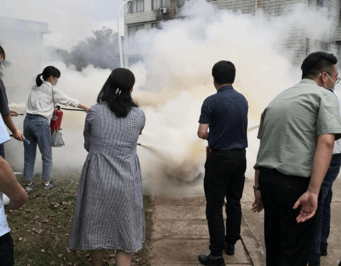 讲座结束后,李科长在室外空地示范干粉灭火器和二氧化碳灭火器的正确使用方法,并指导师生进行灭火实战演练。演练过程中,李科长纠正了部分师生操作不规范之处,使得参加演练的师生有效掌握了灭火器的正确使用方法。
