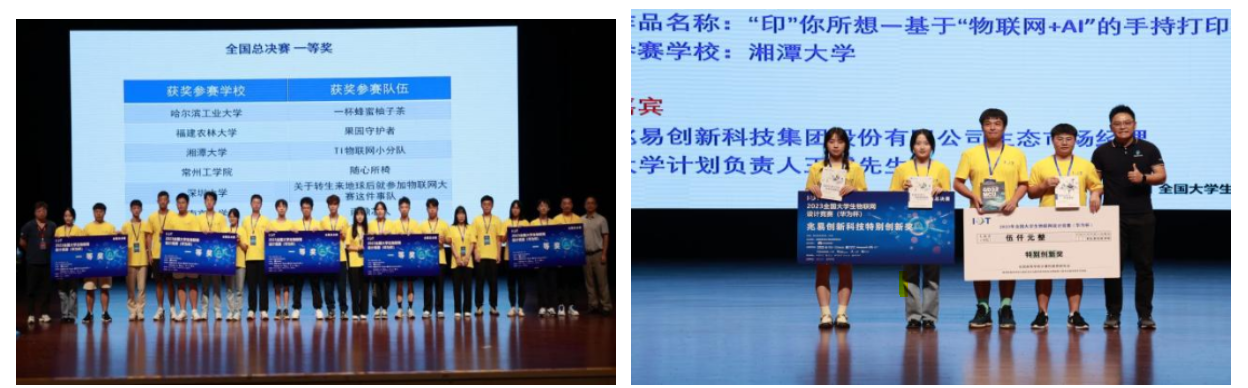 在陈洋卓、蔡晓雯两位老师的指导下,龙荣亮、涂腾辉、李晓婧和黄嘉琪团队作品《“印”你所想·基于“物联网+AI”的手持打印机》获全国一等奖和兆易创新科技特别创新奖,且进入全国六强。在徐玲林、翦丹两位老师的指导下,刘加林、寻佳威、刘恋和沈澳团队作品《铁轨护卫·基于北斗的枕轨螺栓自动涂油养护机》获全国一等奖。在吴亚联、谭貌两位老师的指导下,游蕾、康伟泉、邓贻品和戴睿团队作品《基于AIOT的婴儿守护卫士》获全国二等奖。