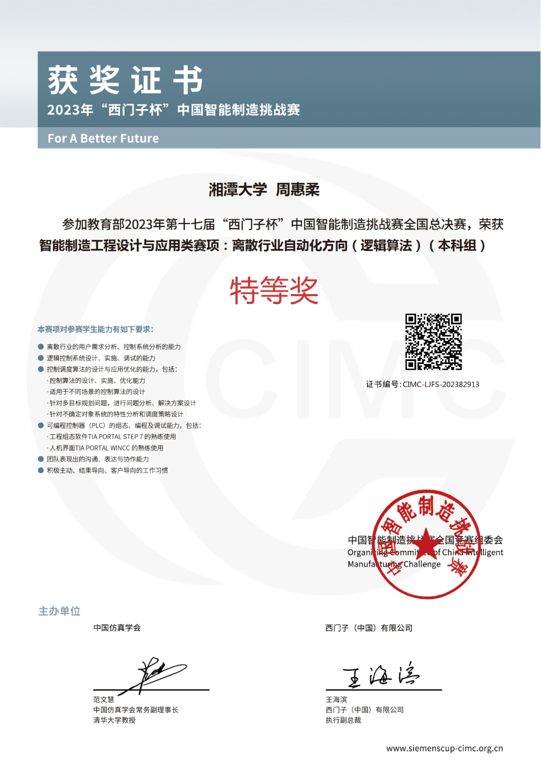 “西门子杯”中国智能制造挑战赛由教育部高等学校自动化类专业教学指导委员会、西门子(中国)有限公司和中国仿真学会联合主办,自2006年发展至今,大赛已成为中国智能制造领域规模最大、规格最高的国家A类竞赛,并进入全国普通高等学校学科竞赛排行榜。大赛内容涉及智能制造领域中的科技创新、产品研发、工程设计和智能应用等,以企业真实的工程项目和科研项目作为竞赛赛题,以真实的工业设备和工业环境作为赛场,以工业企业的工程标准作为考核评分指标,全面锻炼学生解决复杂工程问题的综合能力、系统思维。