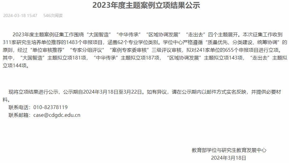 3月18日,中国专业学位案例中心公布了2023年度主题案例立项结果,经过“单位审核推荐”“专家分组评议”“案例专家委审核”三级评议审核,共对241家单位的655个申报项目进行立项。其中,爱漫岛