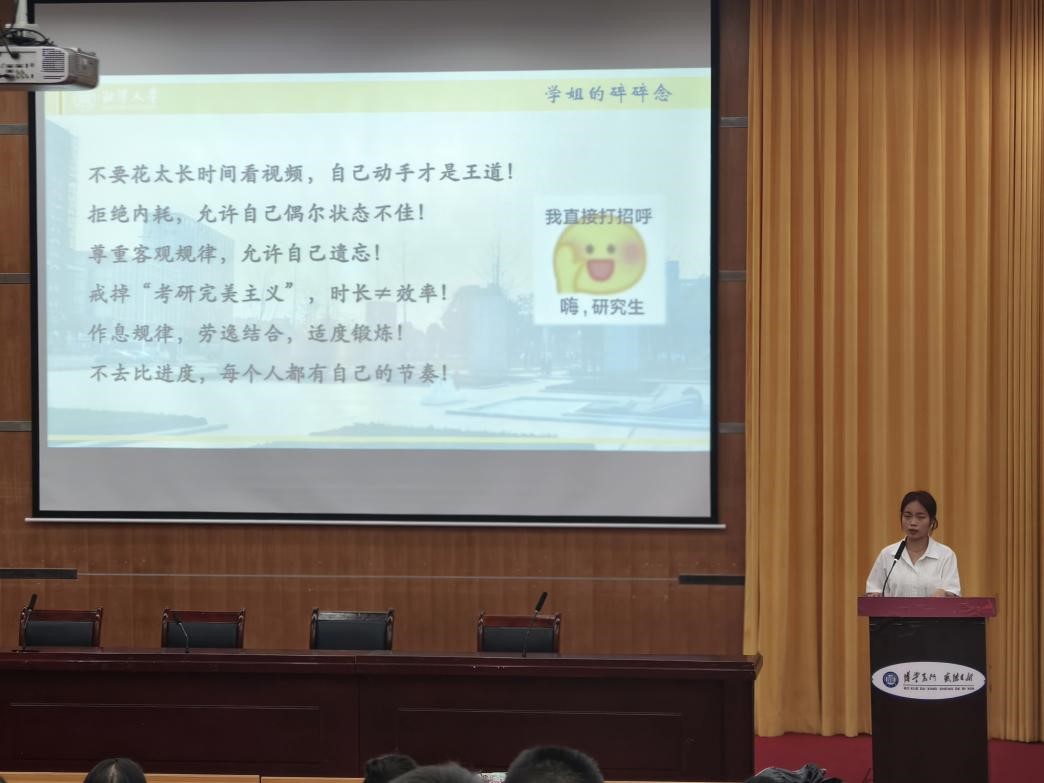 考研经验分享会由陈钰、黄娜、邹学峰、刘康、刘锐萍及马驰宇等6位成功上岸复旦大学、浙江大学、中山大学等知名高校的优秀毕业生进行分享。陈钰表示考研需要坚定的决心和持久的毅力,但更关键的是掌握正确的学习方法和技巧;黄娜建议要关注目标院校的研究生招生计划及录取情况,并且结合自身情况,及时获取关键信息;邹学峰详细分析了考研准备过程中可能遇到的问题并给出解决方法,还结合自身的实践经验,提供了许多考研数学、英语及政治的学习方法和心态应对技巧;刘康对不同目标院校的同学推荐了相应的学习网课,鼓励同学们要时刻保持自己的复习节奏;刘锐萍针对夏令营实践相关经历进行分享;马驰宇特别强调在目标院校的选择过程中,可以根据城市、专业、老师等因素来选择最适合自己的学校,并为之努力奋斗。