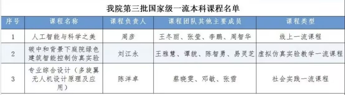 新增3门课程入选第三批国家级一流本科课程,其中,周彦教授作为课程负责人申报的《人工智能与科学之美》入选线上一流课程、刘江永教授作为课程负责人申报的《碳中和背景下庭院绿色建筑智能控制仿真实验》入选虚拟仿真实验教学一流课程、陈洋卓教授作为课程负责人申报的《专业综合设计(多旋翼无人机设计原理及应用)》入选社会实践一流课程。